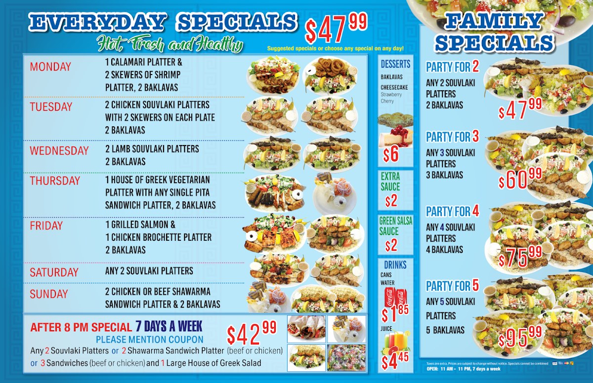 ALL SPECIALTY PLATTERS COME WITH RICE PILAF, GREEK POTATOES, TZATZIKI SAUCE, LEMON & GREEK, CAESAR OR HORIATIKI SALAD. Add another fillet for only $5.50