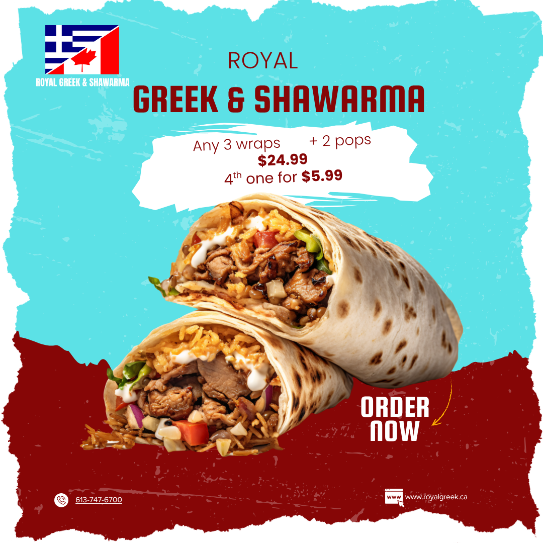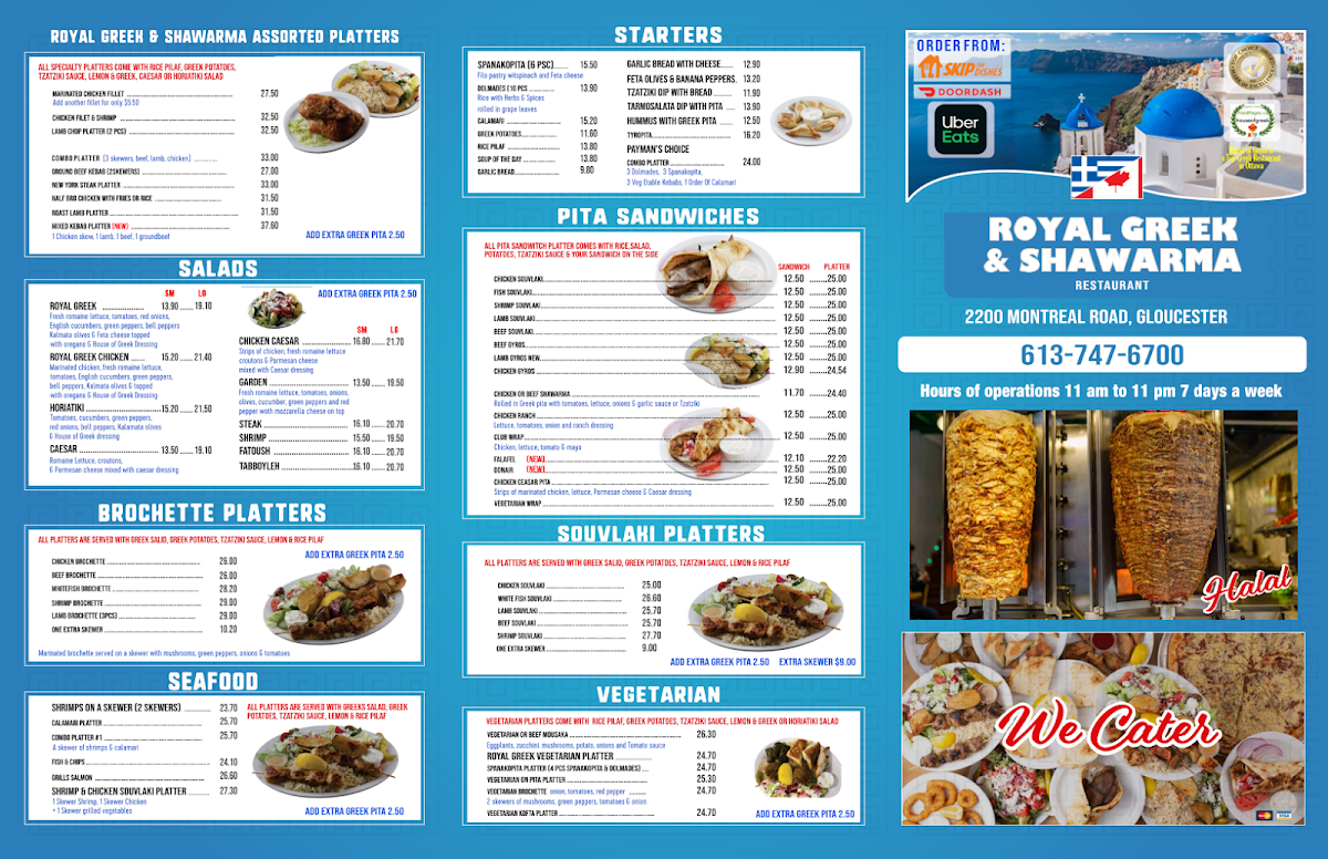 From a reviewer’s perspective, the menu at Royal Greek & Shawarma on Montréal Road reads like a confident summary of what the kitchen does best-classic Greek comfort paired with hearty Middle Eastern-inspired plates. The range of options feels thoughtfully balanced, beginning with crowd-pleasing starters such as SPANAKOPITA (6 PSC), a familiar, flaky introduction that sets the tone for the meal. Freshness and simplicity continue with salads like the ROYAL GREEK, which anchors the menu in tradition, while handheld options such as the CHICKEN SOUVLAKI pita sandwich make the menu approachable for quick lunches or casual dinners. For heartier appetites, the restaurant leans into generous platters, from the ROYAL GREEK & SHAWARMA ASSORTED PLATTERS: MARINATED CHICKEN FILLET to grilled favorites like the CHICKEN BROCHETTE and the CHICKEN SOUVLAKI platter, all clearly designed for diners who want a full, satisfying experience. Seafood lovers are not overlooked, with the WHITE FISH SOUVLAKI offering a lighter yet still flavorful alternative. The vegetarian section adds welcome variety with VEGETARIAN OR BEEF MOUSAKA, appealing to both meat-free diners and those craving a classic baked dish. Rounding out the menu is a robust selection of premium mixed and grilled plates, including CHICKEN FILET & SHRIMP, LAMB CHOP PLATTER (2 PCS), COMBOPLATTERGROUND BEEF KEBAB (2SKEWERS), and the NEW YORK STEAK PLATTER, which together underline the restaurant’s focus on grilled proteins and generous portions. As a conclusion, the menu feels cohesive and reliable-rooted in familiar flavors, broad enough to satisfy different preferences, and clearly structured around comfort, variety, and value, making it easy to see why Royal Greek & Shawarma remains a solid neighborhood choice.